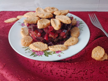 Приготовила салат со свеклой и фасолью без майонеза. Свеклу отварила накануне. Сегодня нарезала домашние маринованные огурцы, свеклу, добавила консервированную красную фасоль, добавила черный перец, чуть- чуть присолила, заправила растительным маслом. Выложила салат порционно, с помощью кулинарного кольца ( но овощные кубики так и норовили рассыпаться по тарелке, всё таки салаты с растительным маслом не так держат форму, как майонезные). Сухарики добавила непосредственно перед подачей, чтобы не успели размякнуть. Салат очень вкусный, сочный, а как аппетитно похрустывают сухарики и маринованные огурчики!!! Спасибо за рецепт, Мария!