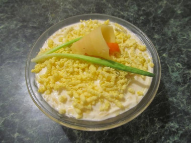 Также в качестве заправки можно использовать не только майонез, но и сметану или натуральный йогурт. Их можно взять по отдельности либо смешать с майонезом в любой пропорции на свой вкус - это снизит калорийность блюда.