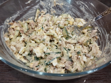 Вот так выглядят слои салата с консервированной сайрой. Но можно все ингредиенты смешать в салатнике и заправить майонезом. Приятного аппетита!