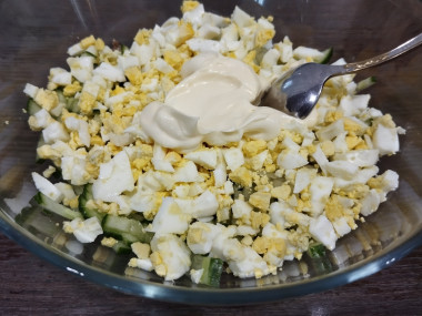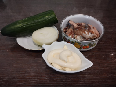 Как сделать салат с консервированной сайрой, огурцом и яйцом? Подготовьте указанные продукты для салата. Огурцы и яйца берите свежие, сайру или другую подобную рыбу в масле, которая вам больше нравится на вкус. Майонез тоже выбирайте по своим предпочтениям: можно низкокалорийный или на перепелиных яйцах, а лучше приготовить самостоятельно.