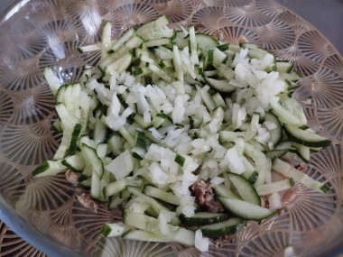 Вторым слоем распределите огурцы, тоже немного прижмите и смажьте майонезом.