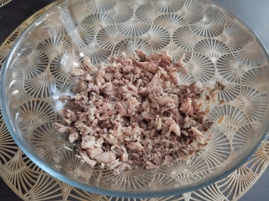 Откройте банку консервированной сайры, слейте жидкость, переложите рыбу на тарелку и разомните ее вилкой до однородности.