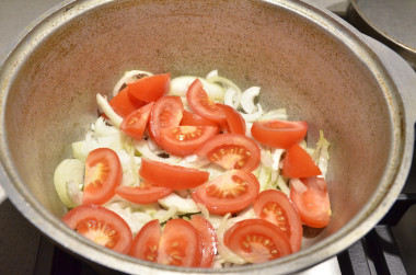 Помидоры порежьте крупными дольками и половину уложите сверху полуколец лука. Помидоры выбирайте спелые, сочные, но плотные, чтобы в процессе приготовления они не расползлись и не испортили внешний вид.
