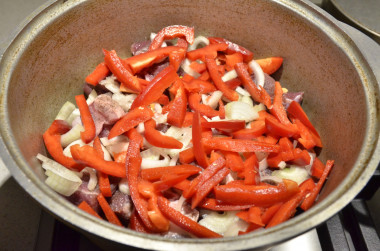 Красный болгарский перец порежьте крупными кусочками и уложите на овощи. Все немного посолите.