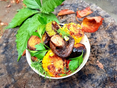 Очень вкусное блюдо получается из запеченных на мангале овощей!!! Лето в разгаре, поэтому готовим такую вкуснятину каждые выходные, но для удобства очищаем все овощи от кожуры, нарезаем и смешиваем, добавив зелень, базилик мелко нарезанный чеснок. Так удобнее брать ложкой и в тарелку, и шашлычок рядом положить!!! Вкуснятина!!!