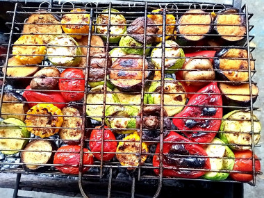 Овощи мариновались примерно два часа. Жарить шашлык решили на решётке. Растительное масло в составе маринада не дало овощам прилипнуть. Хоть кусочки и лежали в два ряда, все отлично пропеклись, главное периодически переворачивать решётку!