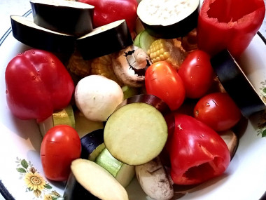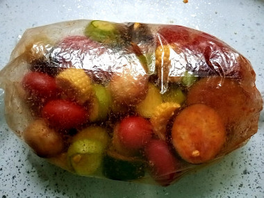 Овощи нарезала крупно, чтобы они не сгорели. Лук не использовала, зато взяла колечки молочной кукурузы. Я не нашла такого большого пакета, чтобы в него уместились все овощи и поместила их в пакет для запекания. Пакет аккуратно потрясла, чтобы маринад равномерно распределился.