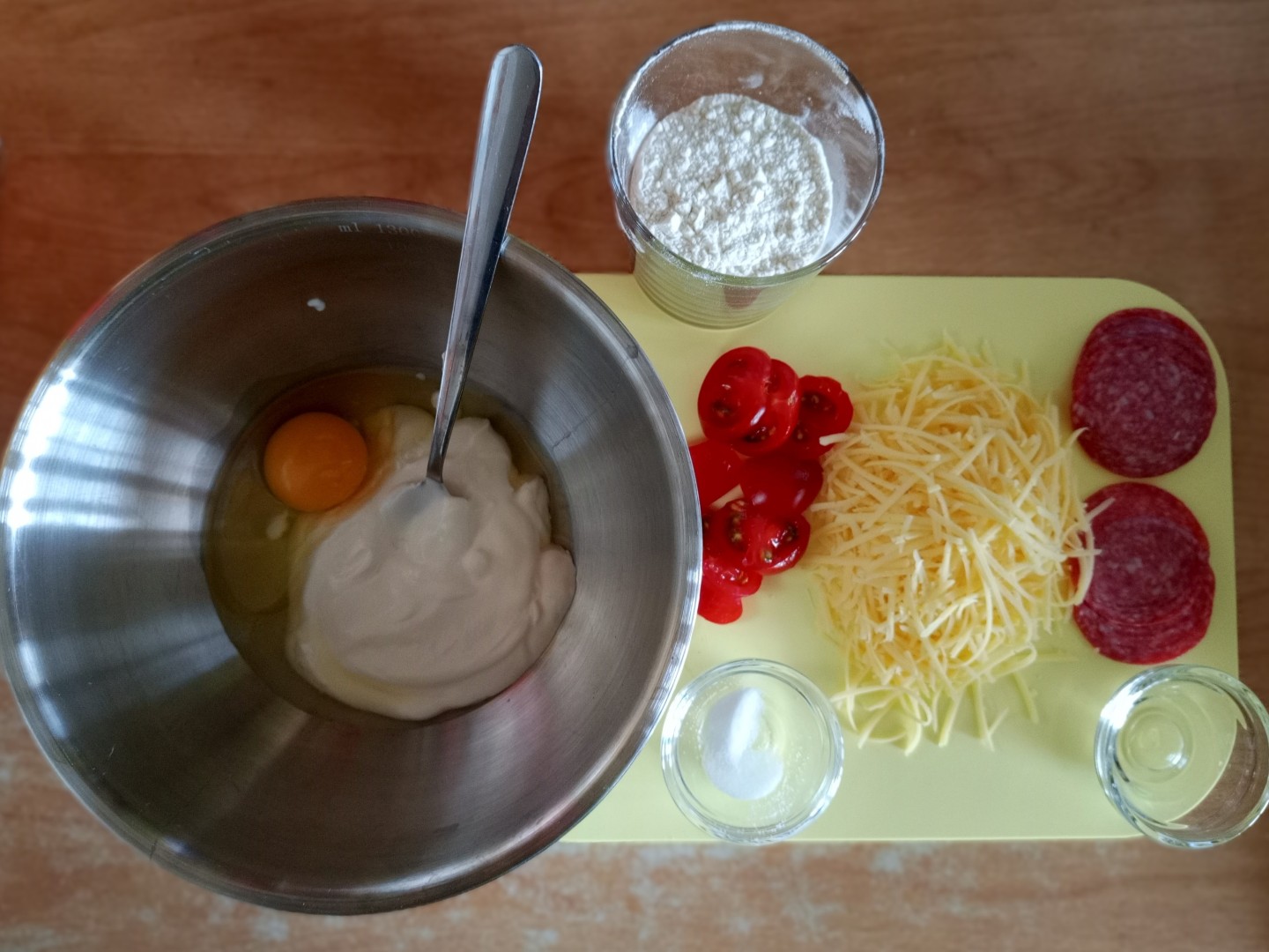 Как сделать пиццу Минутка на сметане на сковороде? Очень просто. Для начала подготовьте необходимые ингредиенты по списку. Муку берите высшего сорта. Масло - любое растительное. Сметана подойдет жирностью 15-20%. Яйца и сметана должны быть комнатной температуры, поэтому заранее достаньте их из холодильника.