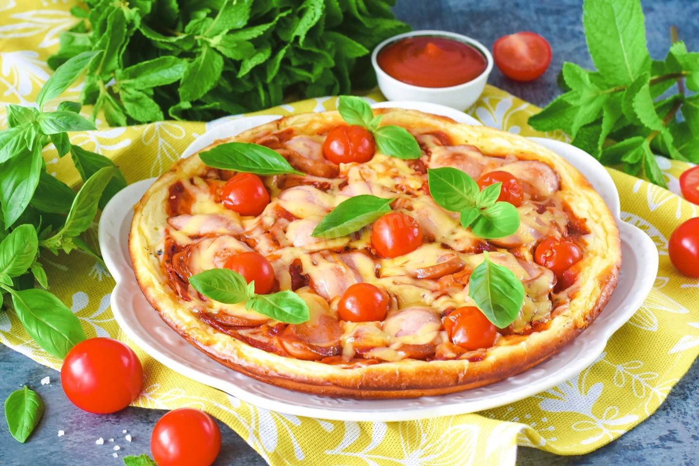 Готовую пиццу «Минутка» переложите на блюдо и подайте к столу, украсив свежим базиликом. Приятного аппетита!