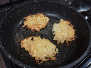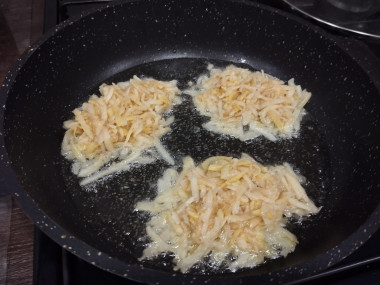 В сковороде разогрейте растительное масло. О том, как подобрать идеальную сковороду, а также как правильно выбрать растительное масло, читайте в отдельных статьях, ссылки в конце рецепта. Выложите в сковороду несколько ложек картофельной массы, быстро разровняйте и придайте форму круглой лепешки. Обжарьте лепешку с двух сторон до золотистой корочки и переложите за бумажное полотенце, чтобы впитался лишний жир. Точно также обжарьте остальные лепешки.