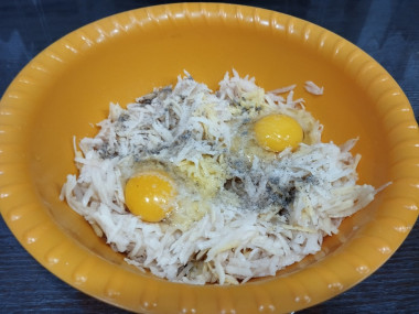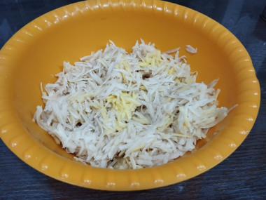 Картофель очистите от кожуры, обмойте и натрите на крупной терке. Выделившийся при этом сок слейте.