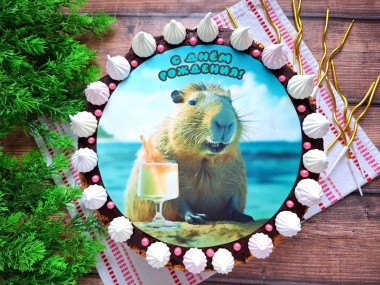Торт собирала, чередуя слои. Между коржами в двух рядах положила бананы. Бисквит пропитывала мультифруктовым соком. Сверху покрыла шоколадной глазурью и украсила сахарной картинкой.