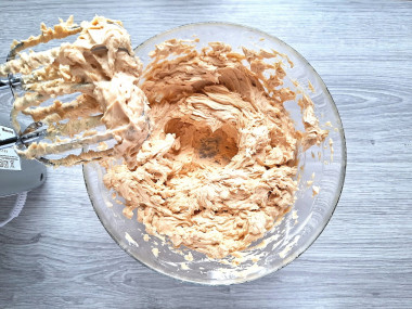 Даже если видно, что обе массы объединились, продолжайте взбивание до посветления крема. Он должен стать более стабильным, воздушным, глянцевым.