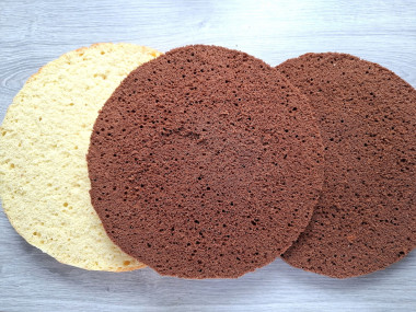 Готовый бисквит извлеките из формы и полностью остудите. Желательно выдержать бисквит несколько часов, чтобы мякиш уплотнился и меньше крошился при разрезании на коржи. Я срезала с бисквита верхушку и разрезала его на 3 коржа.