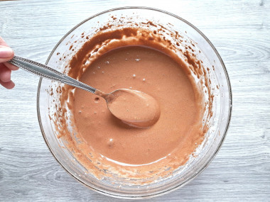 В полученную массу просейте половину муки, смешанной с какао и разрыхлителем. Также бережно перемешайте.