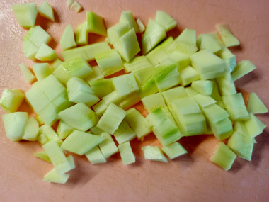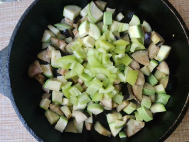 Баклажаны и кабачки помойте, обсушите, удалите плодоножки. У кабачка удалите крупные семена и твердую кожуру, если они есть. Нарежьте все небольшими кубиками.