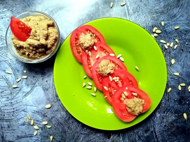 В итоге получится не очень фотогеничный салат, поэтому чтобы его хоть как-то сфотографировать, помидоры я порезала кружками. Для повседневного личного употребления помидоры режьте как нравится. Выложите нарезанные помидоры в салатник, заправьте соусом из семечек, перемешайте и подавайте к столу. Приятного аппетита!