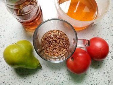 Как сделать сладкий салат из помидоров? Подготовьте необходимые ингредиенты. Для такого салата лучше брать помидоры хорошего качества, спелые, мясистые, желательно домашние. Хорошо подойдёт сорт "Бычье сердце". Семечки подсолнечника берите уже очищенные. Груша подойдёт сорта "Конференция" или другого мягкого сорта. У меня домашние груши.