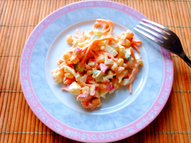 Похожий салат уже много лет готовит моя бабушка, когда мы приезжаем к ней в гости. Он мне очень нравится своим отличным вкусом. В бабушкином варианте салата все те же продукты, кроме корейской моркови.