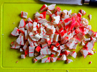 Крабовые палочки разморозить при комнатной температуре. Извлечь из упаковки и нарезать кубиками. Добавить в салатник к яйцам.