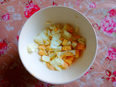 Яйца отварить в воде до готовности, слить воду и залить холодной водой, чтобы они остывали. Остывшие яйца очистить от скорлупы и нарезать. Сложить в глубокую посуду.