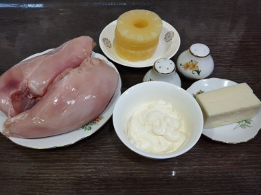 Как сделать куриные отбивные с ананасом и сыром? Подготовьте ингредиенты. Для запеченных куриных отбивных с ананасами и сыром нам потребуется: куриное филе, консервированные ананасы кольцами, сыр, майонез, растительное масло для смазывания пергамента, черный молотый перец и соль.