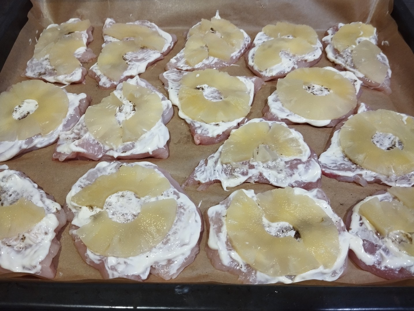 По совету автора кольца ананасов разрезала вдоль. Запекала отбивные 30 минут при 180°.