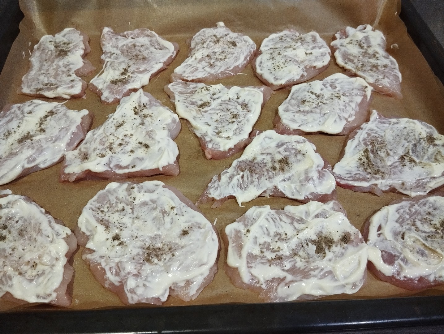 Противень застелите пергаментом и смажьте его растительным маслом. Разложите кусочки куриного филе поближе друг к другу. Смажьте мясо майонезом.