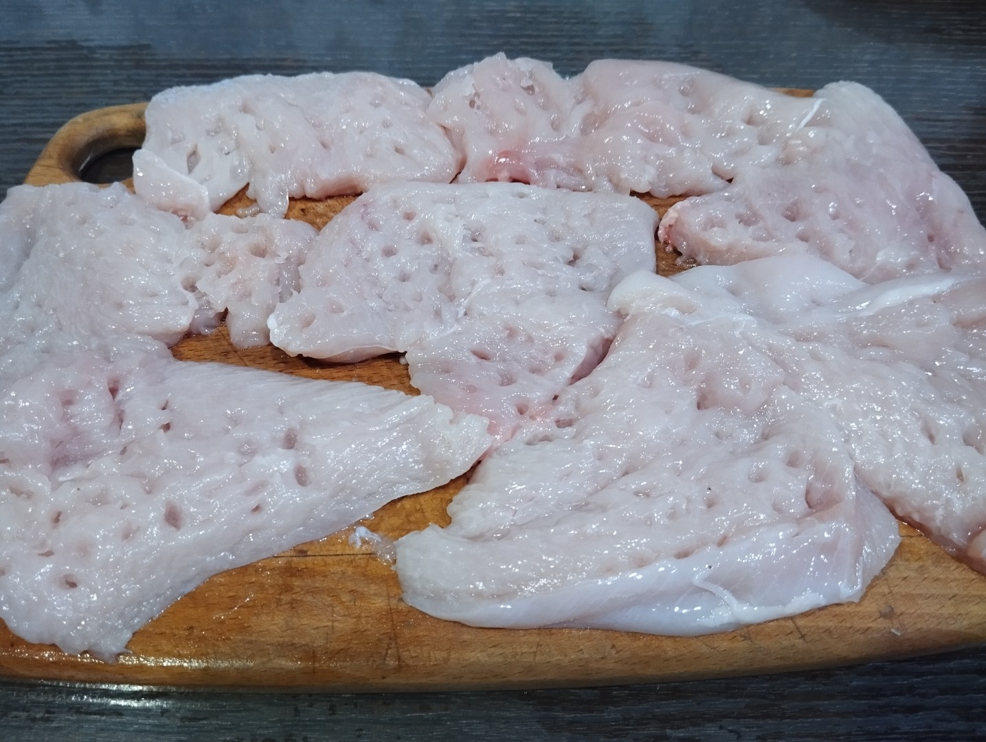 Куриное филе вымойте, обсушите. Каждое филе разрежьте вдоль на две части.