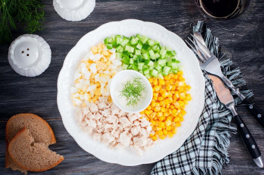 Этот салат можно выложить слоями, используя кулинарное кольцо. Последовательность слоев такая: курица-огурец-кукуруза-яйца. Каждый слой промажьте майонезом.
