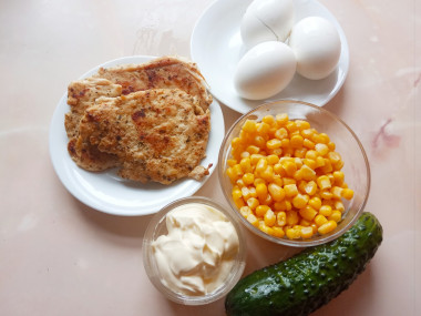 Как сделать салат из куриной грудки, кукурузы, огурца и яиц? Подготовьте продукты. Грудку и яйца предварительно отварите и остудите. Огурец помойте, из банки с кукурузой слейте жидкость. Майонез вы можете сделать сами, домашний. Или использовать смесь майонеза и сметаны 1:1.