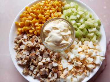Салат курица кукуруза яйцо огурец мне очень понравился. Особо ничего не придумывала - готовила по рецепту. Единственное, что я изменила, это смешала майонез со сметаной. Кстати, нелюбителям майонеза могу посоветовать брать натуральный йогурт без сахара. Для меня это один из любимых салатов, потому что все ингредиенты ты сам добавляешь в тарелку в тех количествах, что тебе нужно. И заправляешь тоже по вкусу: кто-то меньше заправки кладет, а кто-то больше. Вообще подобные салаты хороши для подачи на праздничный стол.