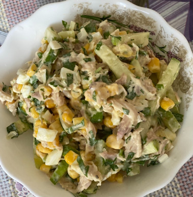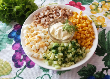 К обеду выбрала рецепт салата Куриная грудка, кукуруза, огурец, яйцо. Для более насыщенного вкуса, куриную грудку разрезала вдоль, слегка отбила, натерла любимыми специями, промариновала буквально 10 минут и обжарила на сковороде. Когда грудка полностью остыла, нарезала ее мелким кубиком, так же нарезала яйца и свежий огурец ( пришлось его очистить от шкурки, а для яркости добавить к нему зелень укропа). В середину блюда поставила креманку с майонезом, и выложила на блюдо сегментами все ингредиенты. Салат перемешала с майонезом уже на обеденном столе. Такая подача красиво смотрится и к тому же салат не успевает " потечь" и расслоиться, что иногда происходит с салатами со свежими, сочными овощами. Очень вкусный салат! Спасибо за рецепт, katushafin!