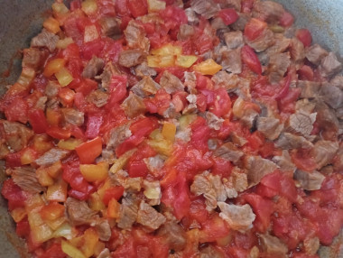 Сначала тушила мясо нарезанное мелкими кубиками с помидорами и болгарским перцем.