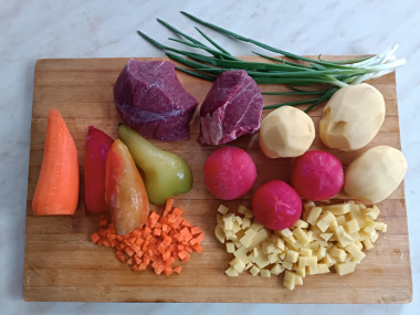 Итак, начинаем готовку с мытья и чистки овощей. Моем картофель, морковь, болгарский перец и помидоры под проточной водой. После чего картофель и морковь чистим и режем на небольшие кубики примерно одинакового размера. Картофель пока заливаем холодной водой, чтобы он не успел потемнеть. Болгарский перец разрезаем пополам, удаляем плодоножку, внутренние мембраны, вычищаем семена, а мякоть нарезаем на кусочки примерно соразмерные морковным и картофельным кубикам. У помидоров также вырезаем плодоножки, затем томаты режем кубиками - небольшими.