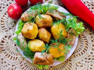 Свинины у меня было чуть больше 500 граммов, так что остальных ингредиентов я взяла из расчета на такое количество мяса. Делала всё в соответствие с рекомендациями в рецепте. Обжаривала картофель и кусочки мяса на среднем огне.