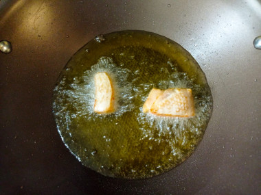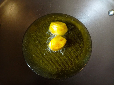 Прежде, чем приступить к запеканию, поочерёдно необходимо обжарить картофель до золотистого цвета. Для этого надо сначала нагреть казан, налить в него примерено один стакан рафинированного масла и хорошо его накалить. Картофель хорошо обсушите с помощью бумажных полотенец. Обжаривайте картофель по 1-2 клубня за раз, чтобы масло не теряло температуру.