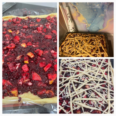 Первый раз делала постный тёртый пирог с вишнями. Для начинки использовала крыжовник, смородину и яблоки. Предварительно проварила с сахаром и процедила от лишней жидкости. Не было времени ждать пока застынет тесто для украшения, поэтому накрутила «колбаски»