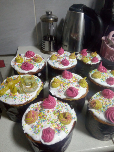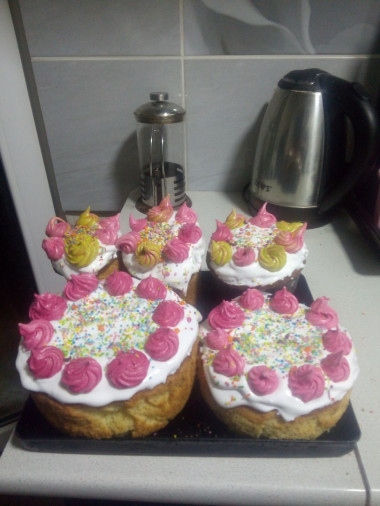 Готовый кулич на молоке на дрожжах украсьте белковым кремом. В белок от одного яйца, добавьте щепотку лимонной кислоты и 50 гр. сахарной пудры и взбивайте миксером до жестких пиков. Получившимся кремом смажьте сверху куличи, украсьте грецкими (или другими) орехами, цукатами, изюмом. Добавив краситель в белковый крем, который у нас остался, хорошо его перемешайте и смажьте куличи. Украсьте сахарной пастой, розочками, снежинками и звездочками.