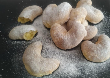 Тесто разделила на шарики, размяла руками в овал,выложила начинку и сформировала печеньки в виде бананов. Выпекала при 180° 30 минут. Готовое печенье "Бананы" с творогом посыпала сахарной пудрой!