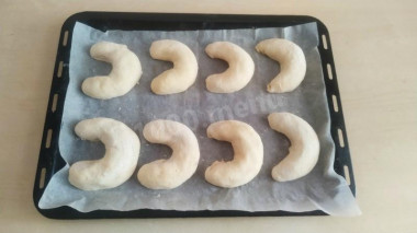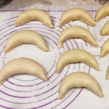 Скрепите края теста как у пирожка, затем переверните заготовку швом вниз и придайте печенью форму банана. Сформируйте таким образом печенье из остальных кусочков теста.