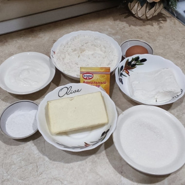 Масло сливочное я растопила, добавила сахар, ванильный сахар, сметану. Все перемешала миксером до однородности. Добавила муку с разрыхлителем, замесила мягкое тесто. Убрала в холодильник на 20 минут. А в это время приготовила начинку. Творог размяла,добавила яйцо,сахар,крахмал и перемешала.