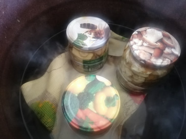 По подготовленным банкам разложите грибы, залейте их оставшимся маринадом до плечиков банок, но чтобы он полностью закрывал содержимое. Банки с грибами поставьте в кастрюлю, наполненную горячей водой. На дно обязательно нужно положить хлопчатобумажную тряпочку, чтобы стекло не лопнуло при нагреве.