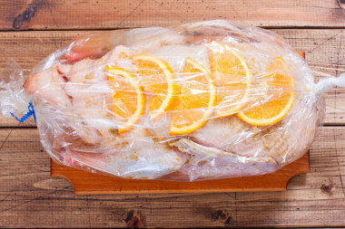 Маринованную утку поместите в форму для запекания. Плотно уложите в брюшко нарезанные апельсины. Примерно в середину брюшка поместите палочку корицы. Если корицу не любите, не добавляйте.