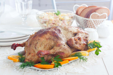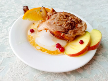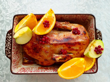 По желанию можно дополнительно порезать апельсин и яблоко кружочками и выложить их к утке за 15 минут до конца приготовления.