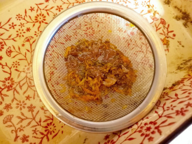 На ужин решила впервые приготовить запеченную утку с апельсинами в духовке. Утку замариновала на ночь, после чего отправила в духовку под фольгой. И, несмотря на то, что утку я хорошо промыла, после 1 часа 40 минут выделилось очень большое количество крови, которая в духовке запеклась. На фото в сите я как раз показала осадок. В итоге я решила весь выделившийся бульон слить, так как он был коричневого цвета.