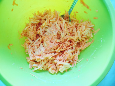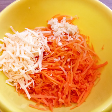 Всыпаем в большую глубокую миску все подготовленные для салата продукты: морковь, сыр и чеснок, добавляем майонез. От вкуса майонеза также будет зависеть вкус салата, так что берите проверенный, хотя лучше всего сделать домашний.