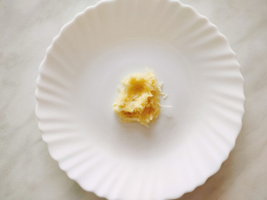 Чеснок очищаем и трем на мелкой терке или пропускаем через пресс. Чеснока можно сразу взять не два, а три зубчика, а можно уже в конце приготовления добавить по вкусу, если захочется сделать салат поострее.
