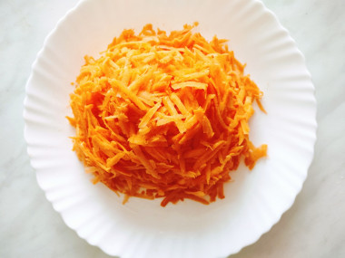 С морковки снимаем кожицу тонким слоем и нарезаем ее соломкой. Я разделила морковку на 3 части, затем каждую из них нарезала на пластинки, а уже пластинки на соломку. Резать нужно как можно тоньше. Для нарезания также можно использовать терку для корейской морковки или обычную, но мне понравился именно такой вариант.