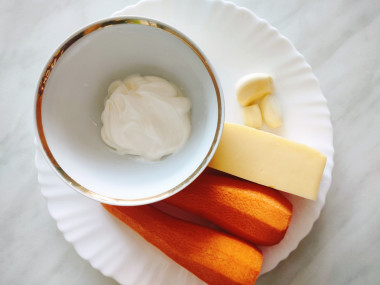 Подготовим продукты для салата. У меня большая морковь как раз таким весом, как нужно, если у вас морковь меньше, то берите две или три, чтобы вышло 250 грамм. Майонез жирностью 50%. Сыр с паприкой.